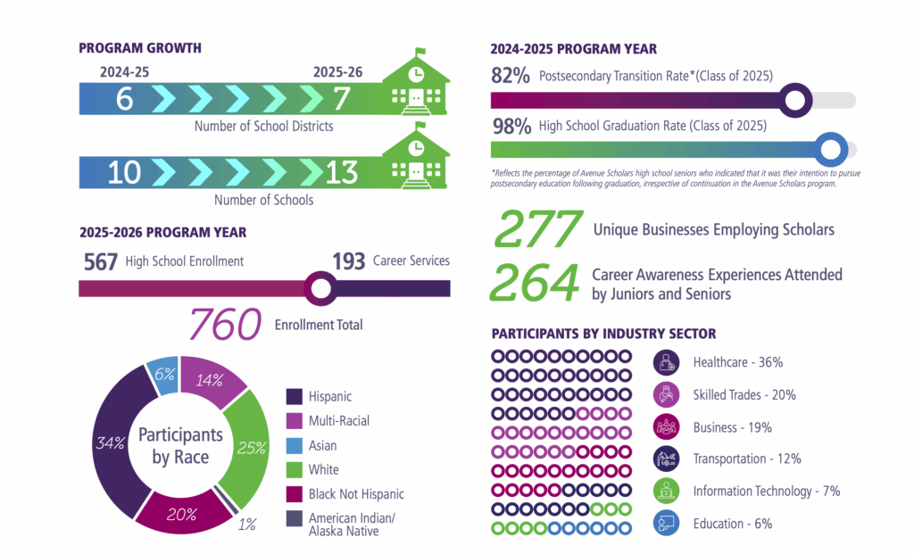 Each year, the Avenue Scholars team gathers key performance indicators and key outcomes to publicly share the progress of the program. In many cases, the findings are historic. In addition, Avenue Scholars has a tradition of transparency and also shares when the organization has run into a challenge, but most importantly, how the challenge was navigated.